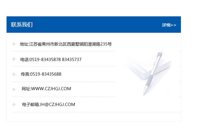 地址:常州市新北區友邦商務大廈1幢16、17層  電話:0519-85101652  傳真:0519-85112595  郵編:213022  網址:www_cz-jiayue_cn.cnbyzgmt.com  郵箱:xiajifengaa@163.com